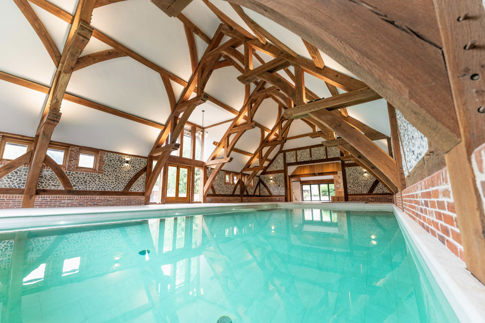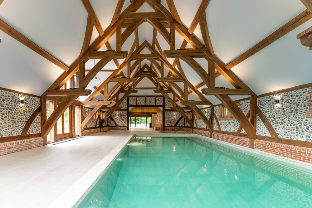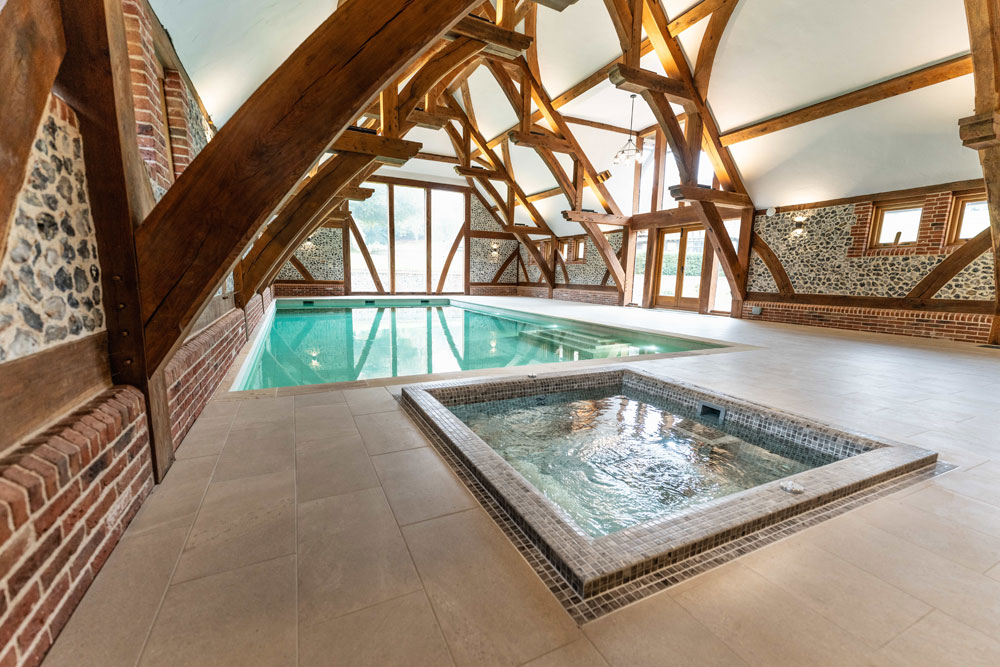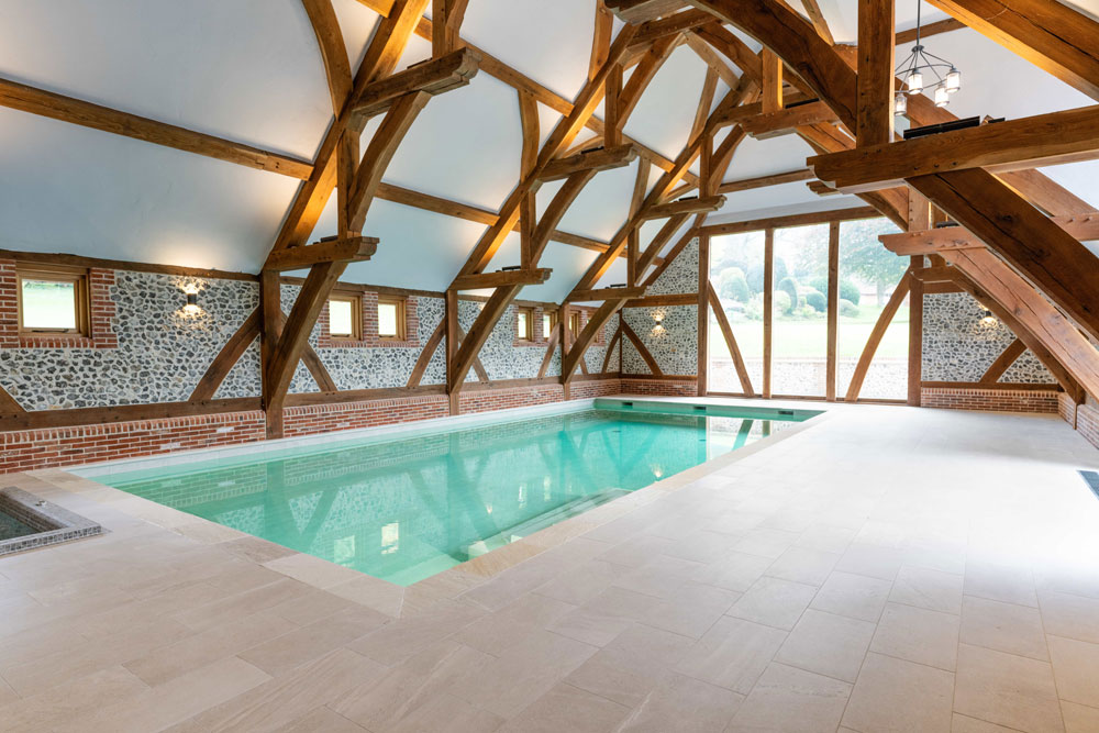 features a bespoke pool, spa, sauna, and indoor kitchen. Waterford cream tiles create a striking focal point against ancient flint walls, while a rare 10m hammerhead oak beam—unseen in UK builds for 200 years—showcases extraordinary craftsmanship.